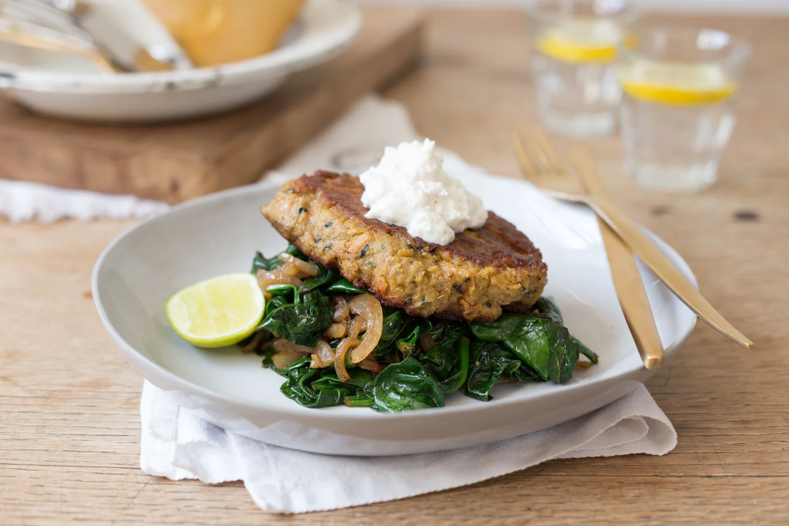 Inspired by a lunch I had at the Rooftop Cafe at London Bridge last weekend, these delicious chick pea fritters are lightly spiced with warming cumin and ground coriander. Sat on top of wilted spinach, topped with coconut riata and a scattering of toasted flaked almonds, they really couldn’t be an easier dinner.