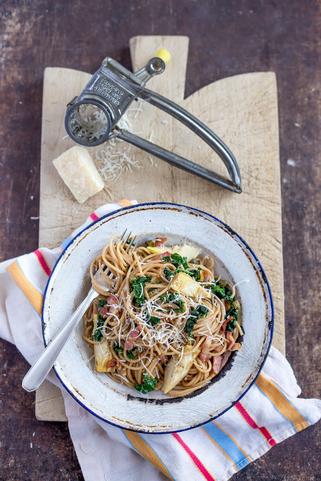 Wholewheat spaghetti is a new discovery at ours, and it’s a nutty and delicious one — I just wish we’d given it a try sooner. Add to that some smoked streaky bacon (crisp, of course), Parmesan shavings, irony greens and juicy lemon, and you’ve got yourself a simple and light meal. But, to take it to another level, try adding a few smooth and rich artichoke hearts and some punchy, tart capers.