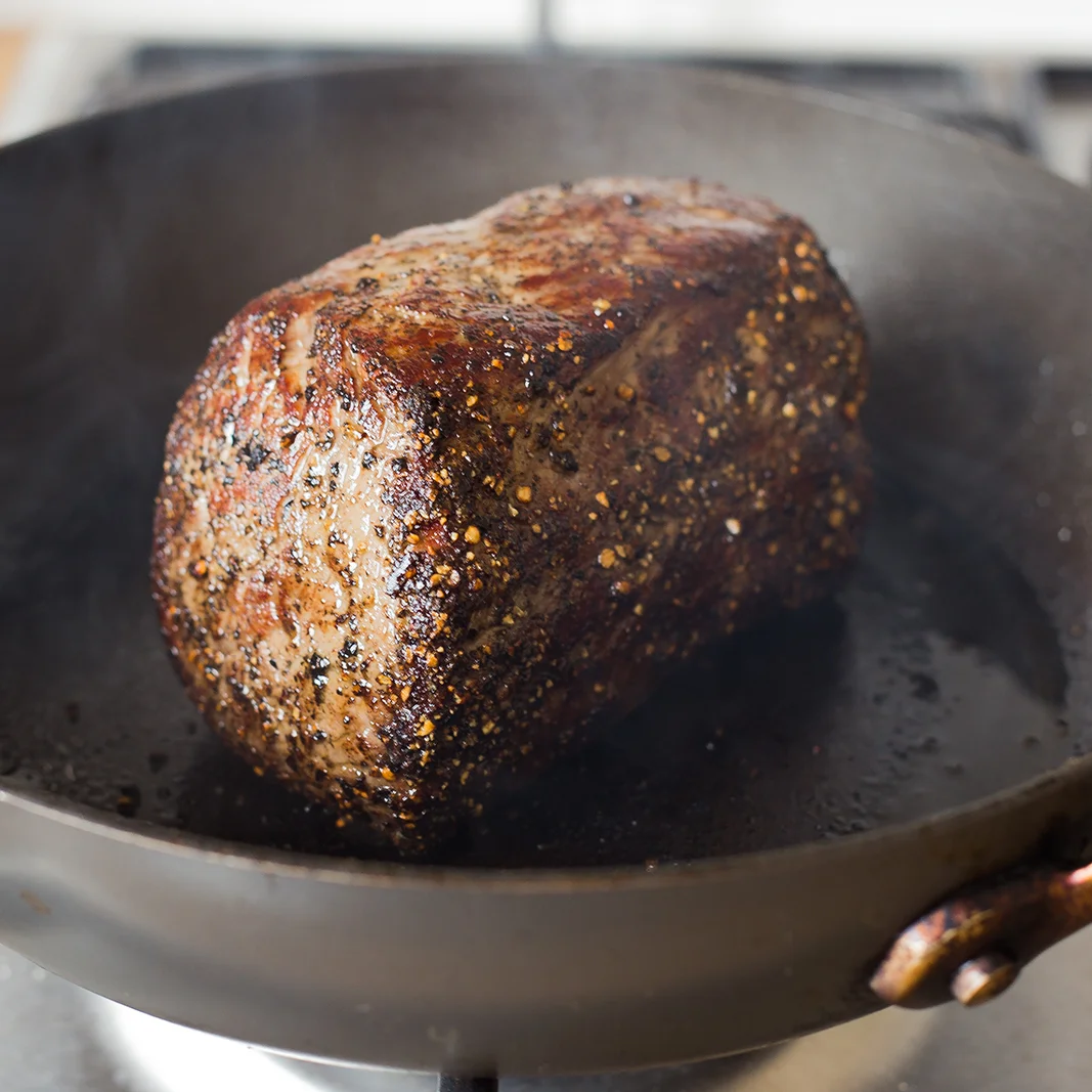 - Get a pan smoking hot and add the oil, then place the beef fillet in the pan, turning so it’s seared all over — you want about 2 minutes per side, including the ends.