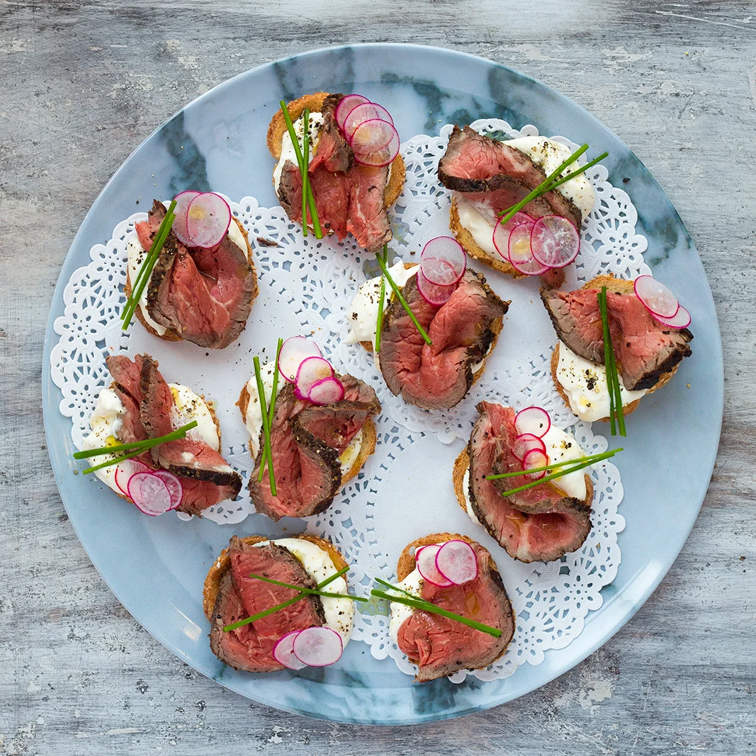 - When you’re ready to serve, toast the baguette rounds and top with the horseradish, then take the beef out of the freezer (it shouldn’t be frozen, just firmer and chilled down) and slice as finely as you can with a sharp knife, draping the beef slices over each of the crostini.