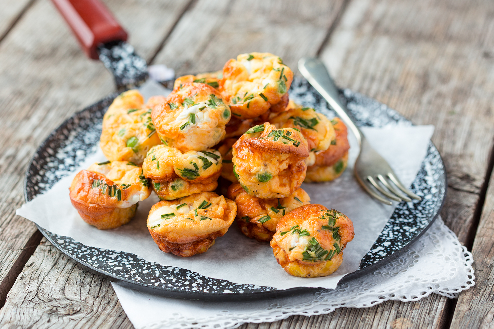 - Top each with a pinch of chopped chives and place in to the oven. Check them while cooking: you’re looking for them to rise up like soufflés and turn golden brown. Once this has happened (in around 12 minutes) remove them from the oven – they’ll then sink back down.